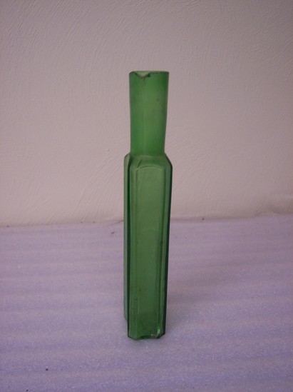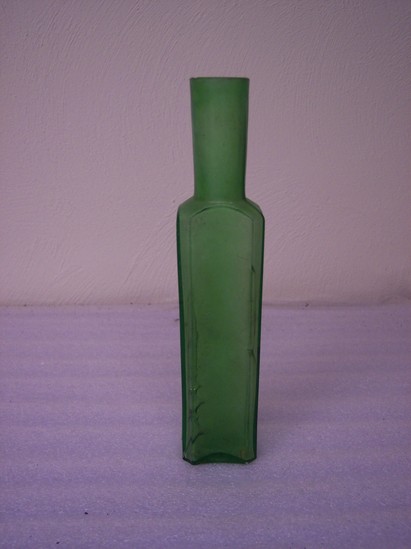 Bright green glass bottle, rectangular body, pressed in mold. Tubular neck with wide opening.