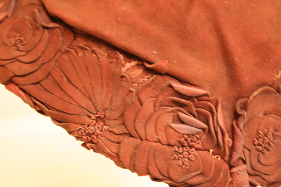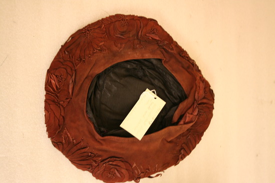 Circular hat; rim decorated with flat flowers made with suede petals and embroidered centers and leaves