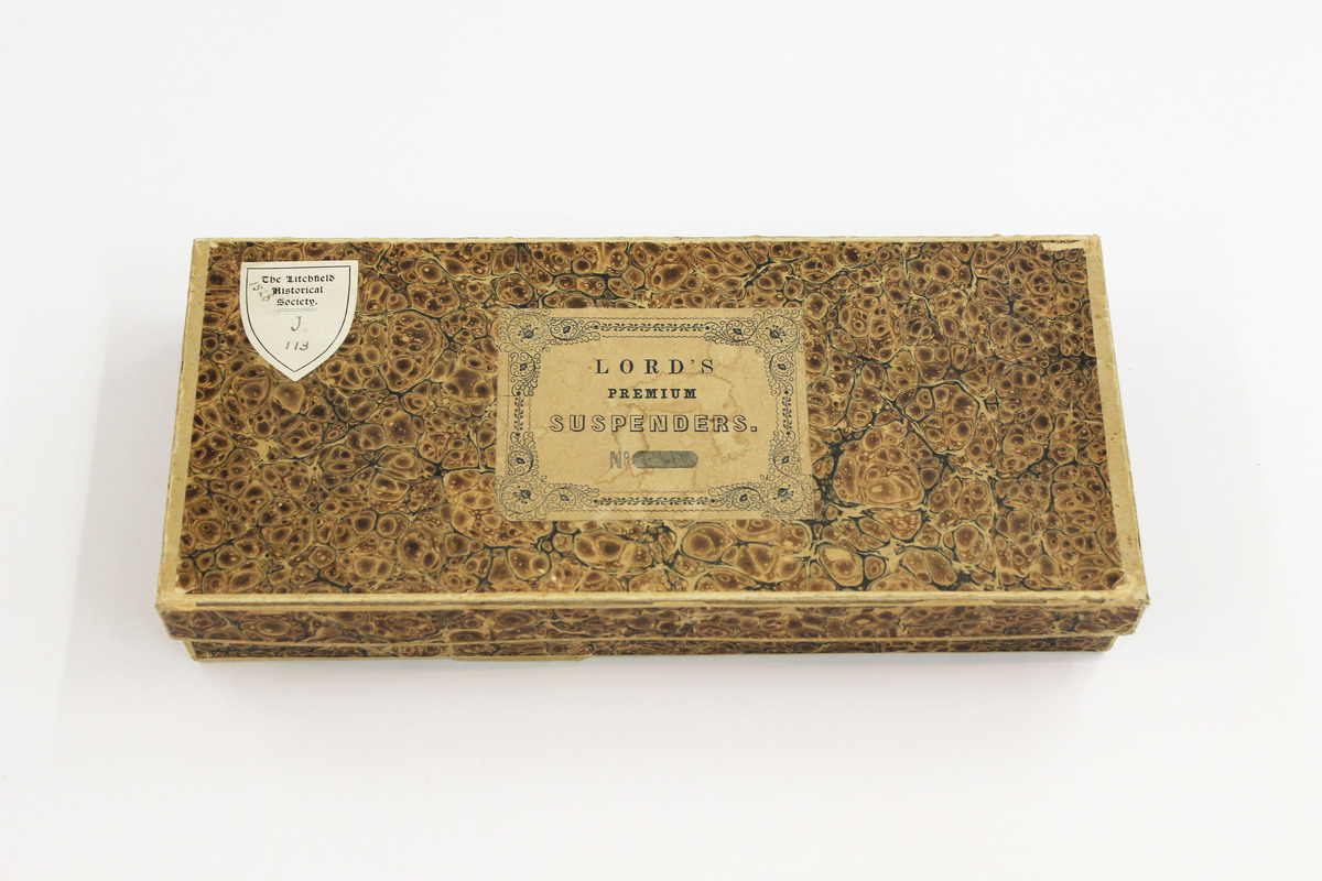Possibly made and sold by Erastus A. Lord or his son, Augustus A. Lord, both leather goods manufacturers in Litchfield who may have produced suspenders.