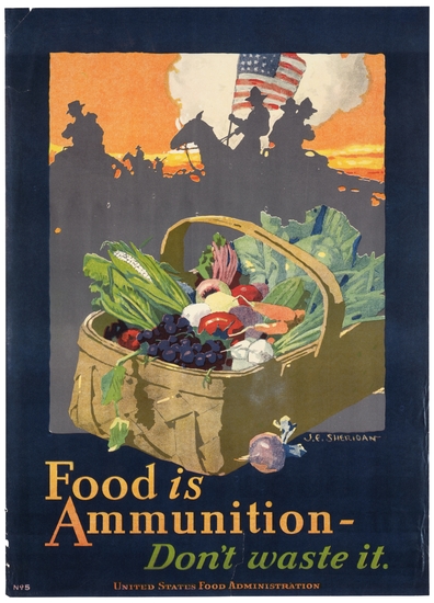 World War I poster. Dark blue background with picture of cavalry in silhouette with flag in front or an orange sky. Garden produce in large basket in foreground. "Food is/ Ammunition/ Don't waste it/ United States Food Administration." printed below image.