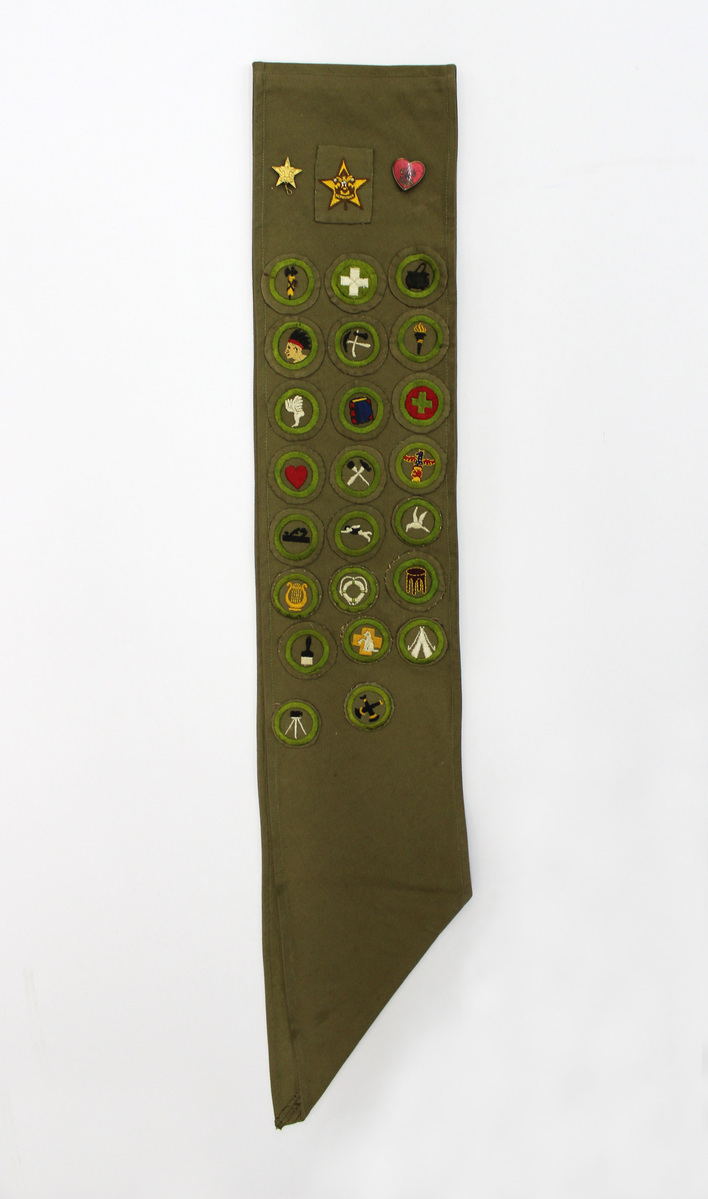 Khaki cotton twill uniform sash, Boy Scouts of America. Double fabric and sewn to a point at the bottom. The front is decorated with two metal pins, one fabric patch, and 23 fabric merit badges signifying various achievements.