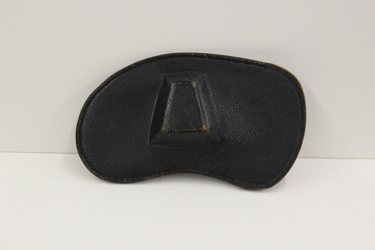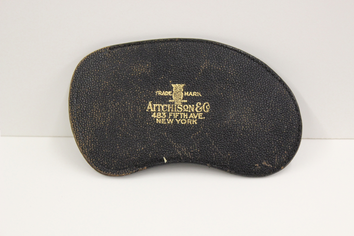 Tooled leather eyeglass case for pince nez style eyeglasses. Outside of case is black tooled leather. Printed on the front in gold is an owl with the words "Trade" and "Mark" on either side. Printed below the owl is "Aitchison & Co./483 Fifth Ave/New York." On the back of the case is a protruding pyramid-shaped section. The interior of the case is brown leather.