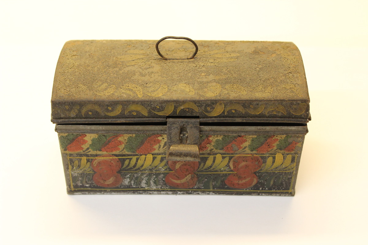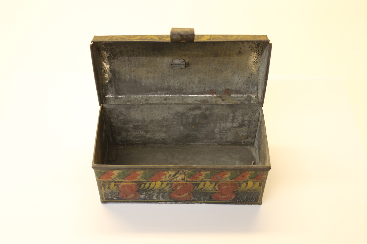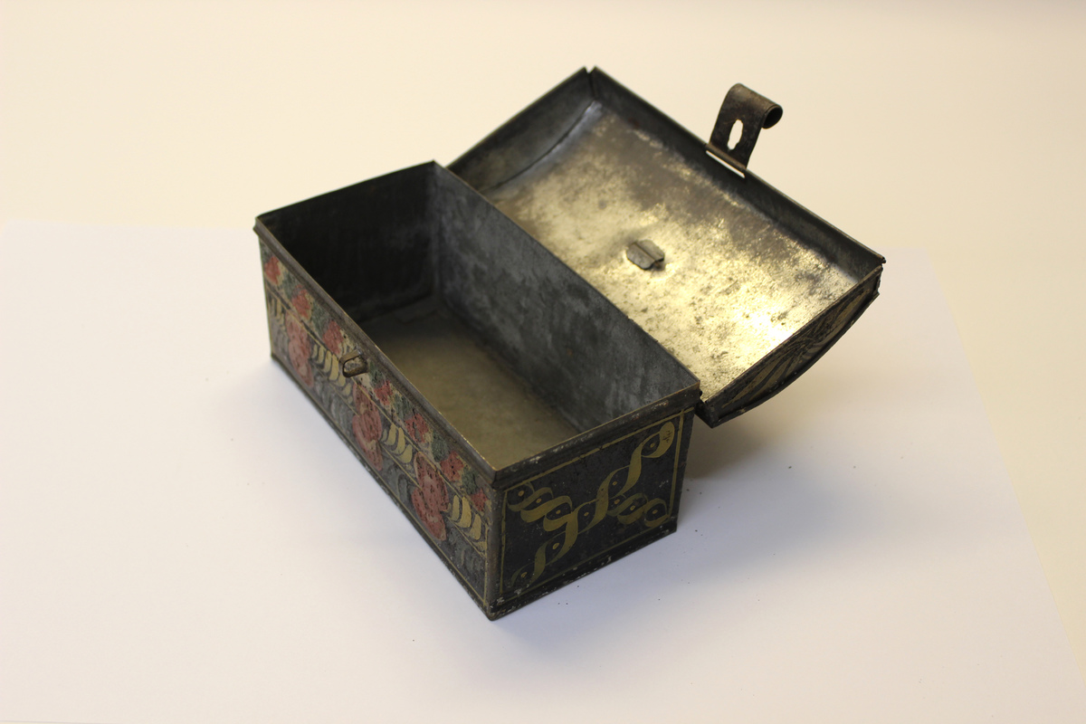 Painted tin (or toleware) box. Rectangular box with hinged lid. Lid has a curved top and small metal loop at center; attached to front of lid is a hinged latch. Box is painted black with a second layer of painted decoration. Lid has floral and geometric designs in yellow. Base has geometric designs in yellow on sides, and floral designs on front in red, green, and yellow.