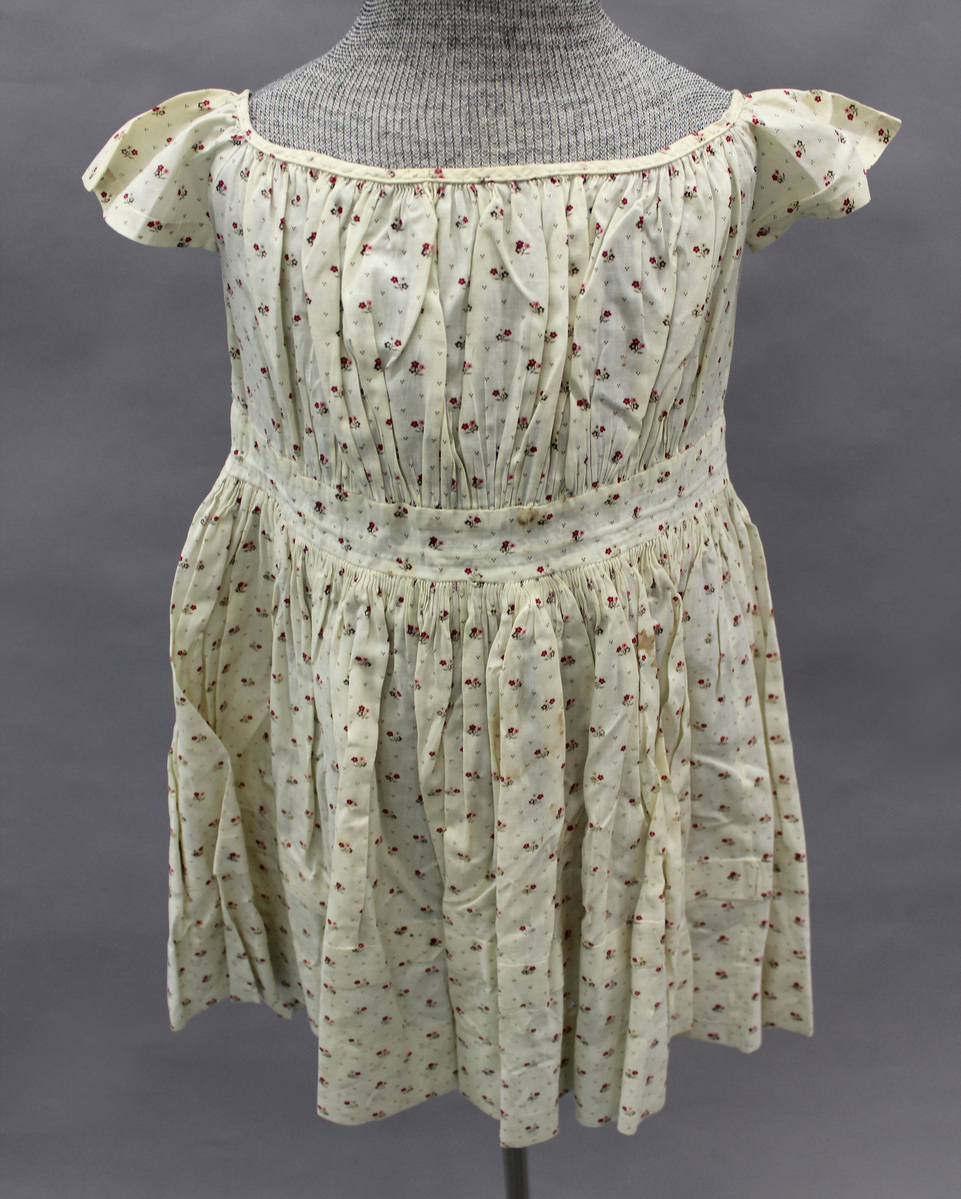 White and red cotton calico child's dress; scoop neckline with bias edge; short flared sleeves; gathered bodice; waistband; gathered skirt with large tuck; center back opening with drawstrings at waist; all hand-stitched