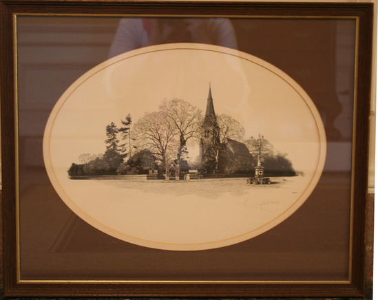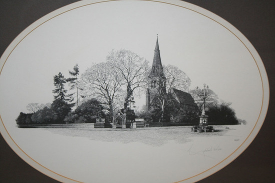 Engraving of an English church - Gothic style with pointed steeple and large arched stain glass window on front. Gothic arched entrance in stone wall around church. Elaborate lamp post/street sign in foreground on right hand side. Signed by artist in bottom right hand corner. Framed under glass. Double mats - bottom one cream (same color as paper) and top one brown. Wooden frame with gold fillet. Mat boards cut in oval shape. Signed in pencil in bottom right hand corner "Geldart 303/600" Label on back of frame "To the Rotary club of Litchfield/Connecticut U.S.A. our 'twin club'/to commemorate the occasion of/the Rotary International Convention/3rd-6th June 1984/Poynton & District Rotary Club/Cheshire England." Sticker at bottom of frame "Geldart Gallery/Henbury NR/Macclesfield Cheshire/Tel Macclesfield 25392"