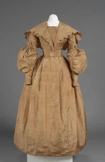 A: Dress - goldish/brown colored silk; long full skirt, no lining; thick band of silk emphasizes waistline; bodice tucked fabric going in diagonal lines, overlapping at waistline; long sleeves - vertical rushing at shoulder, sleeves poof out from mid-upper arm to cuff, very fitted cuff with hook & eye closure; hook & eye down back; bodice lined with glazed linen B: Pelerine - same material, lined in linen; scalloped edge along bottom; two ends narrow to a point