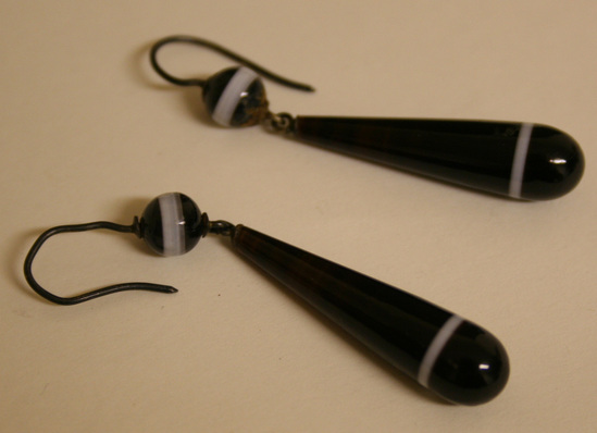 Pair of earrings for pierced ears. Black colored iron loop on back. Dark puple agate ball with white stripe in center attached to iron loops with tear drop shaped pendant attached with iron claps to bottom of ball. Pendant is purple agate with thin white band near bottom.