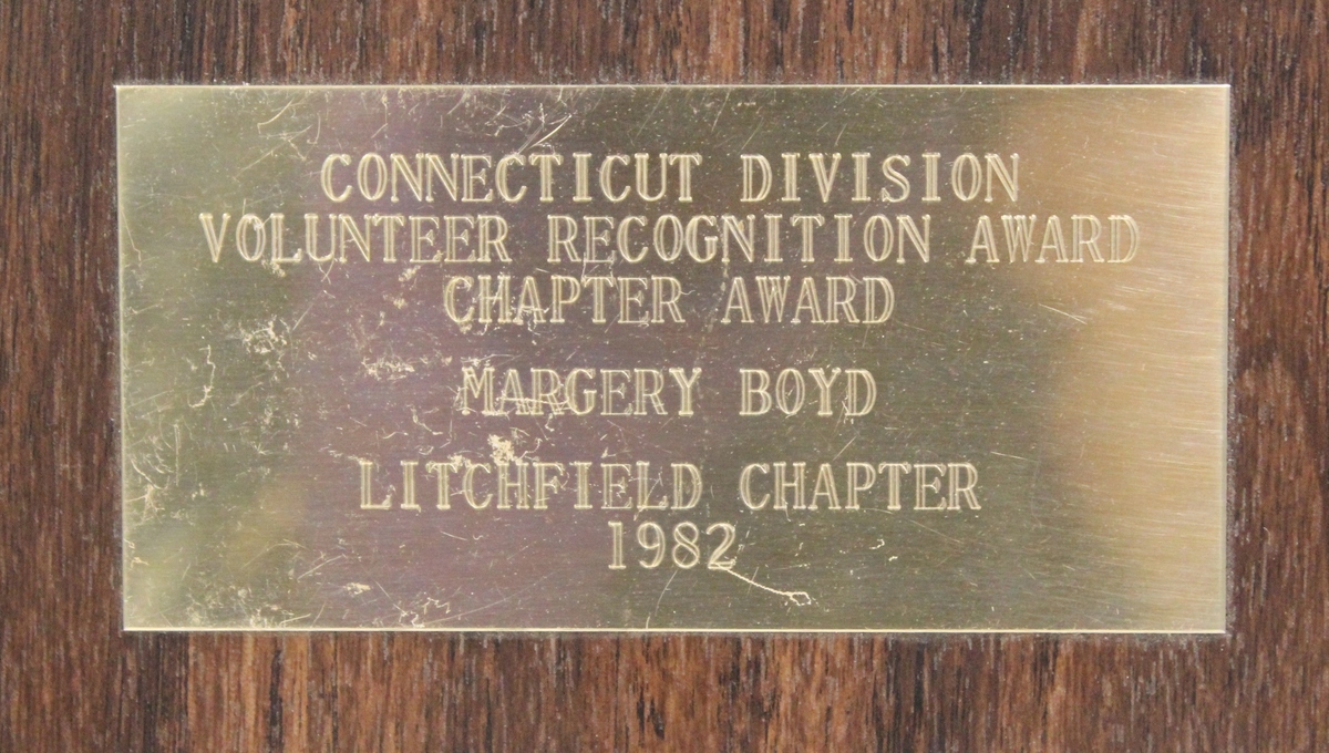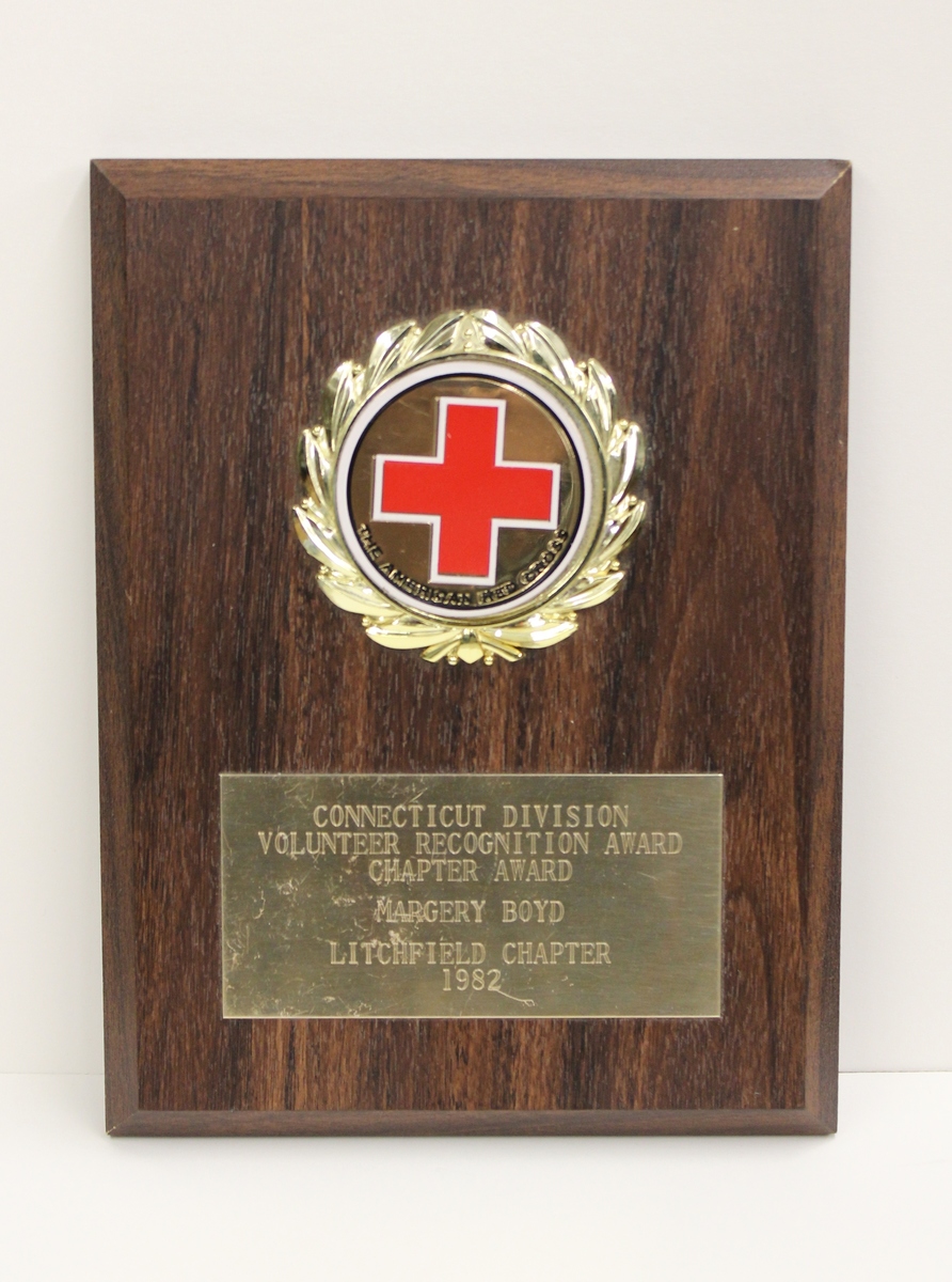 Award plaque presented to Margery Boyd by the Litchfield Chapter, American Red Cross, in 1982. Dark stained wood with gold metal nameplate and Red Cross emblem. Nameplate inscribed "CONNECTICUT DIVISION/VOLUNTEER RECOGNITION AWARD/CHAPTER AWARD/MARGERY BOYD/LITCHFIELD CHAPTER/1982." Emblem appears to be a Red Cross circular sticker adhered to a gold metal or plastic wreath. Sticker on back reads "ED CLARK/TROPHIES & PLAQUES/69 CRESCENT ST./STAMFORD, CT/203-325-3814."