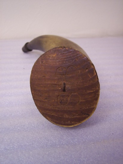 Wood plug nailed into large end. Metal loop for thong nailed into wood plug. Initials "SB" carved into wood plug. Small end flared to accommodate other end of string or thong. "For Revolutionary War" written on body of horn in ink. Light green paper sticker, lettering ripped off, is on horn also