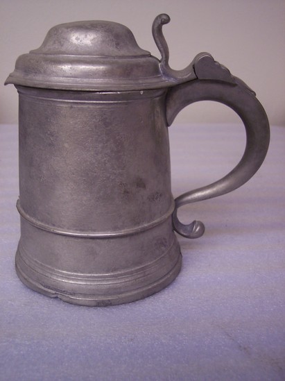 Double domed lid, S-curved handle with bud terminal. Scroll thumb-piece, molded base and lip, fillet low on body.
