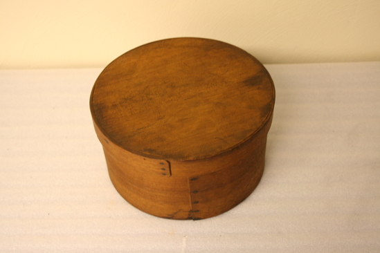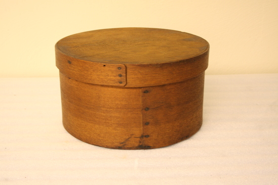Round bentwood box with lid. Top and bottom pegged, sides riveted with tacks.Likely used for food storage.
