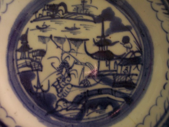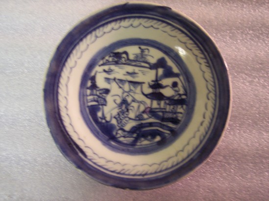Round plate of a heavier and cruder construction than the saucers from this set. It is standard blue and white "Canton" river scene depiction. Wide blue band around the edge.