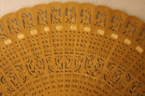 Wooden fan. Sticks run entire length of fan. Balsa wood with filagree cut out borders of geometric and scroll motifs. Narrow silk ribbon woven between sticks near top of fan. Brass ring at bottom.