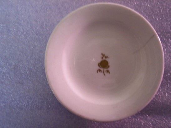 Small, white round plate with gilt line rim and inner circle. Small, gilt floral spray in the center of the plate. Wide foot rim.