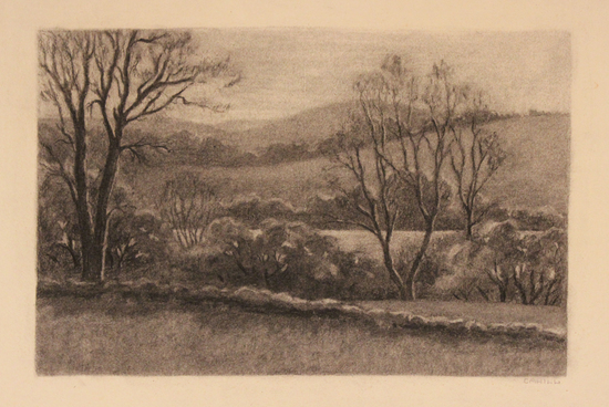 Sketch of a landscape executed in charcoal. Composition shows rolling hills with trees. A rock wall runs across the foreground of the image. "CAHILL" signed in pencil below lower right corner.