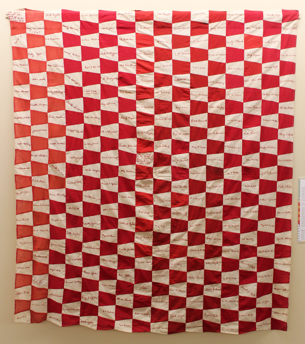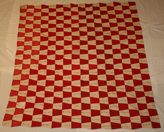 Patchwork quilt top, friendship style, alternating red and white cotton trapezoidal patches, each white patch embroidered in red with a different persons' signature. The center with "Made in 1925/for the Benefit of/the Ladies Aid of/Milton, from the/Proceeds of Ten Cents" In the upper left hand corner in a white patch "This quilt bought the sum of $22.50 for the Ladies Aid" Sewn together by hand, edges bound by machine. Material take from flags or banners - red squares are various shades of red