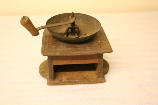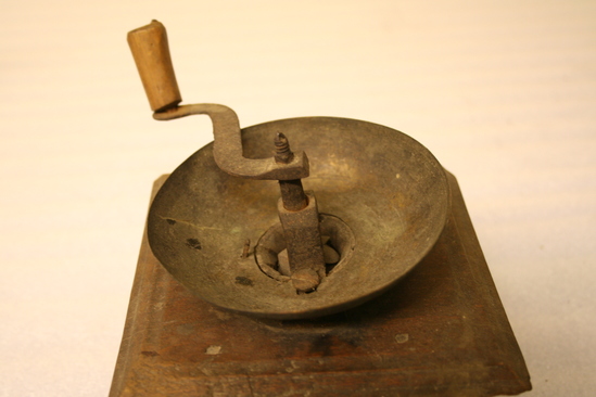 Wooden box with round wooden base. Opening on one side where drawer would be inserted. Drawer missing. Round metal dish on top of box. Crank with wooden handle protruding from center of dish. Metal gears underneath round metal dish to grind up spices and herbs.