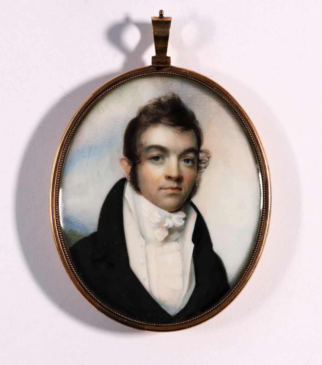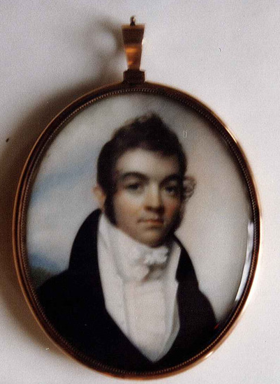 SITTER: William Wolcott Ellsworth (1791-1868) was born in Windsor and attended the Litchfield Law School in 1811. He was a member of Congress from 1829 to 1834 and Governor of Connecticut from 1838 to 1842. ARTIST: Born in Milton, a village in the town of Litchfield, Anson Dickinson began advertising himself as a miniature painter in 1802. He traveled to New York in 1804, where he was painted by Edward Greene Malbone, the leading American miniaturist of his day. Dickinson painted over 1,500 miniatures over the course of fifty years, traveling as far as Canada and South Carolina to paint. He kept a studio in New York for a period, and returned frequently to Litchfield where he painted prominent residents and students of the Female Academy and Law School.