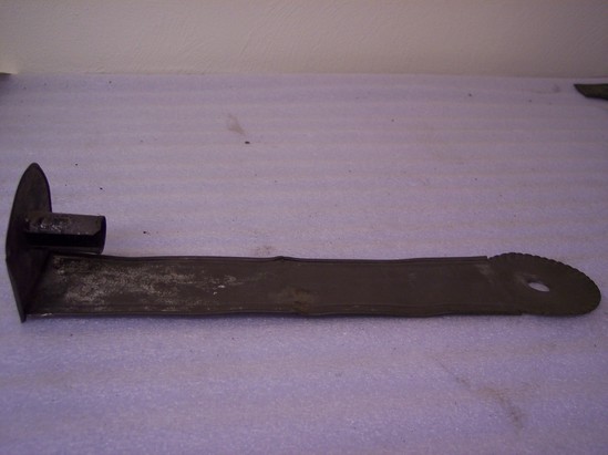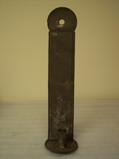 Shaker-style wall sconce for single candle. Straight sides with rounded top. Rounded platform for candle juts out from base, has rounded pedastal for candle. Sides and platform have rolled edges, top has crimped edges and 1/2" diam. hole for hanging.