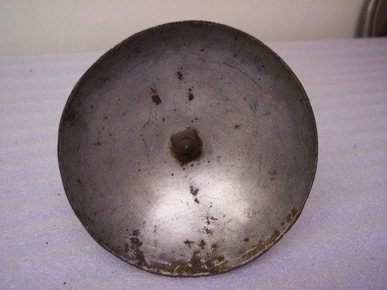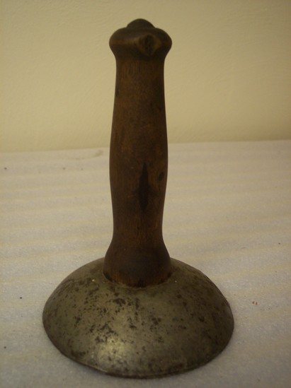 Shallow steel cup bolted to wooden handle. Used in preparing pork, to remove hog hairs from skin.