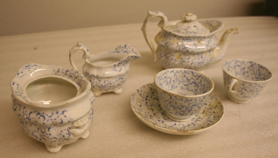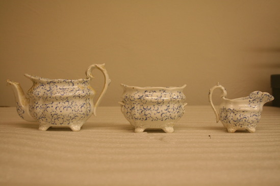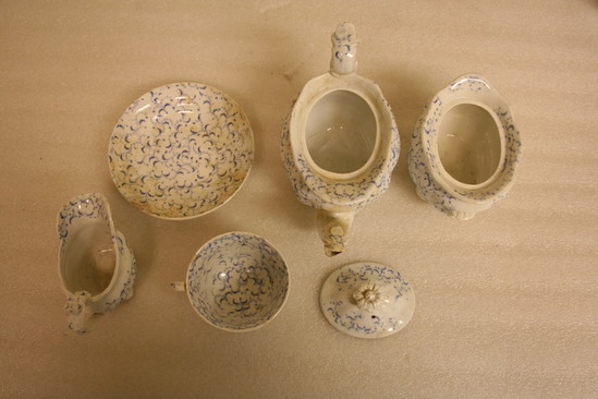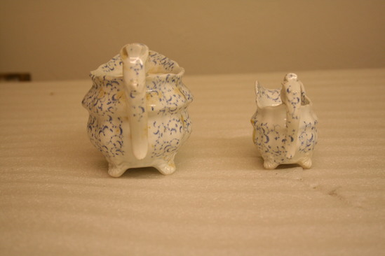 Doll's tea set with pattern of organic blue transfer printed all over decoration with tiny vines on each piece A- Tea Pot 4" high x 6 1/2" long x 3" wide - shell formed, four feet paneled oval pot with heavy shoulders and boat flared shaped rim, S spout and ear shaped handle, domed top with flower finial B - Sugar Bowl with Lid - 2 3/4" high x 4" long x 3" wide - same squat boat shaped with flower shaped handles on end C - Creamer - 2 3/4" high x 3 3/4" long x 2" wide - open spout miniature version of tea pot D - Saucer - 3/4" high x 4 1/2" diameter - ring base, rounded flared sides E,F - Cups - 1 3/4" high x 2 3/4" diamater of top - ring base with flared bottom, sloped straight sides, one has ear shaped handle
