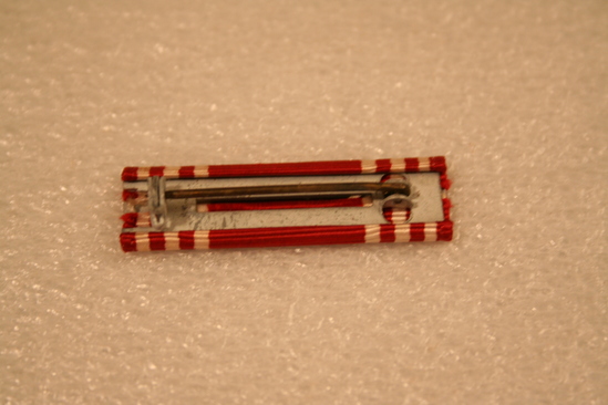 Rectangular pin covered in red and white striped grosgrain ribbon. Issued along with Army Good Conduct medal.