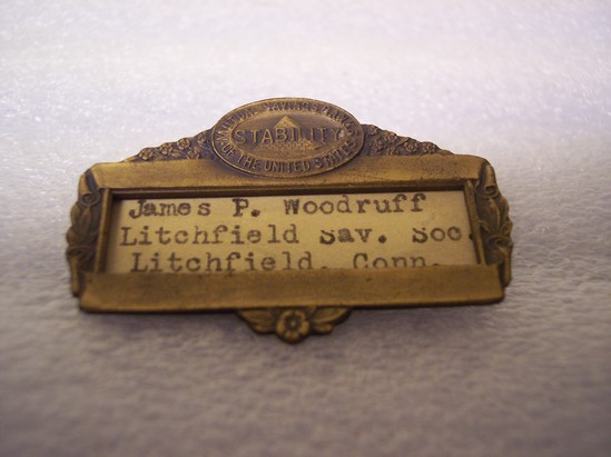 Metal badge, rectangular shape, bronze colored metal. Solid bar on top and bottom, scroll and leaf design on each side. Above top bar is circle with word "STABILITY" imprinted in center over a pyramid. Printed around edges of circle "MUTAL SAVINGS BANKS/OF THE UNITED STATES" Interior of badge recessed. Piece of paper inside typed "James P. Woodruff/Litchfield Sav. Soc./Litchfield, Conn". Pin on back