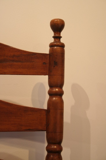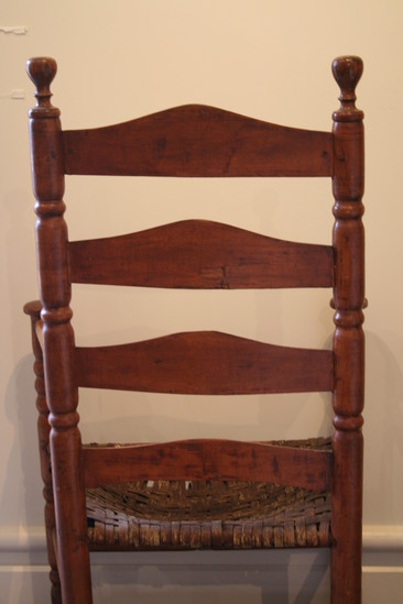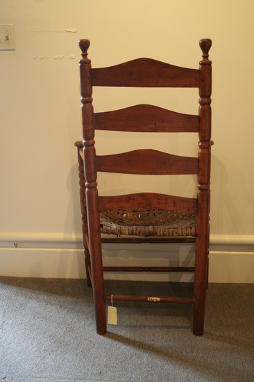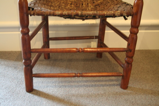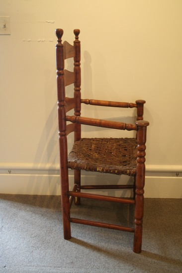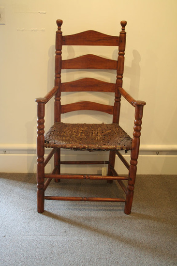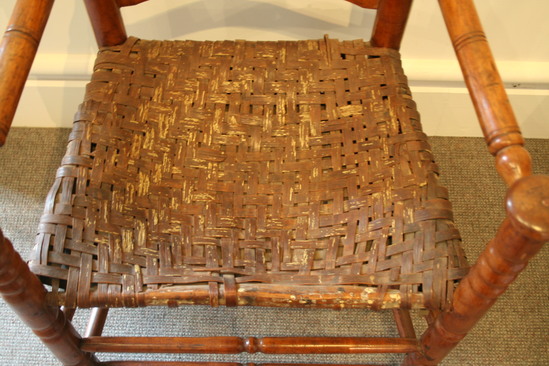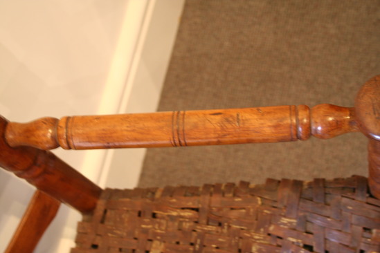 Arm chair; split cane seat; front legs with two single ring turnings - three near top and mushroom terminal; two front stretchers with single ring turning in center; two plain round side stretchers and a single back stretcher; back round post legs through seat and three single ring turnings ending in ring and bulbous finial; four humpback slats; turned arms, sloping to mushroom ends with incised rings and turned ends