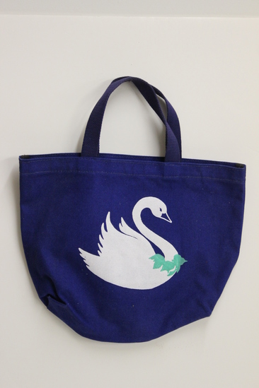 Royal blue canvas tote bag with navy blue twill tape handles. Printed on the front is a white swan wearing a garland of green leaves at the base of his neck. Bag is machine stitched.