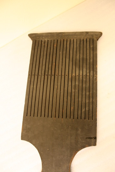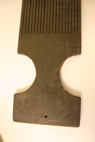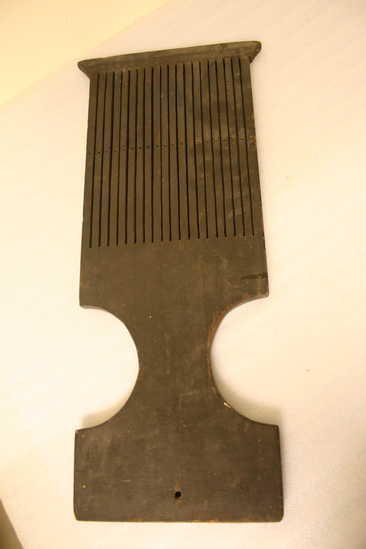 Wooden tape loom, painted black. Rectangular shape with semi-circular cut outs on each side near center of loom. Top of tape loom has 19 thin rectangular voids cut out. Small hole at base of each solid splat that is created by voids. 20 splats total. Single larger hole at center of base for hanging loom. Solid piece of wood across top of loom.