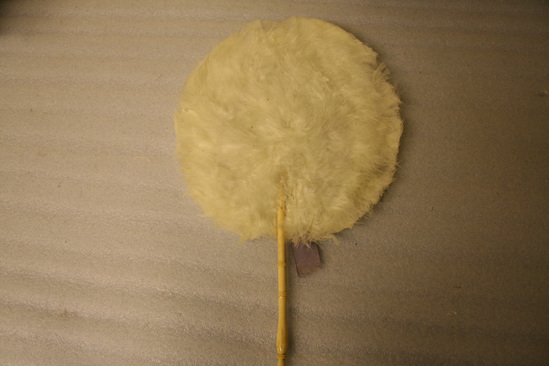 Fan of white feathers. Round shape. The fan does not collapse. Single white ivory stick handle at bottom. Purple bow at center of fan.