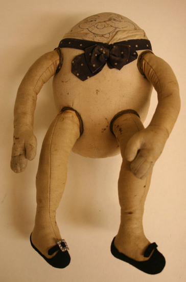 Humpty-Dumpty cloth doll. Egg-shaped white body with blue polka-dot tie, collar, ink-drawn face. White cloth arms and legs. Black felt shoes, one with steel buckle.