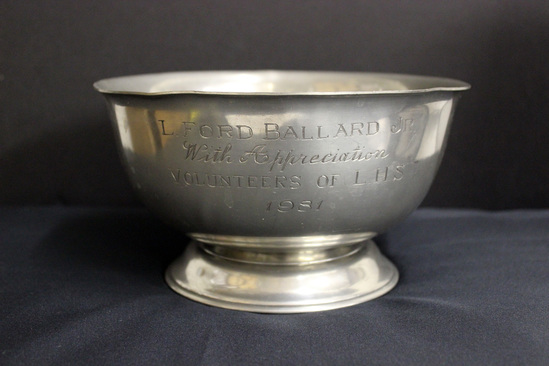 Pewter bowl with short pedestal foot. "L. FORD BALLARD JR./ With Appreciation/ VOLUNTEERS OF L.H.S./ 1981" engraved on one side of bowl.