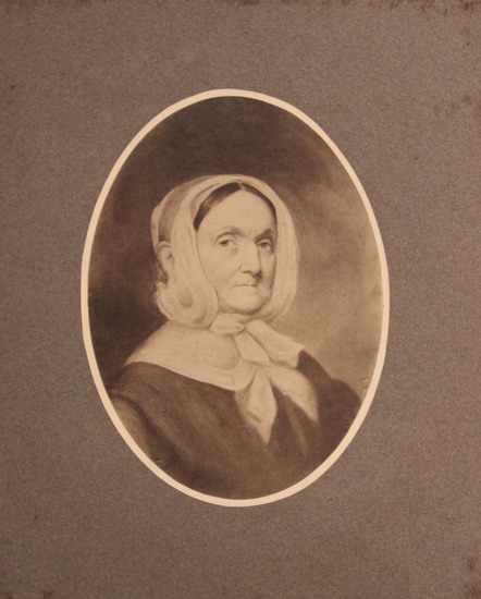 Black and white photographic print (possibly a salt print) of a portrait of Deborah Ann Judson Smith. Image looks to be of an original portrait, but there is no indication of what medium the original artwork was executed in. Some pencil sketching has been added over top of the print on the face and around the body of the subject. The oval shaped print is mounted on a 10" x 12" piece of gray mat board.