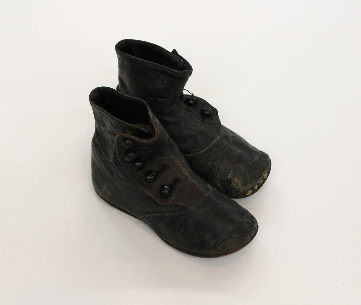 Pair of black leather shoes/boots; scalloped edge at side opening; five buttonholes and black buttons; white cotton twill lining; black cotton lining along inside top; printed markings inside: "4 1/2E64445" in both; brown leather bottoms