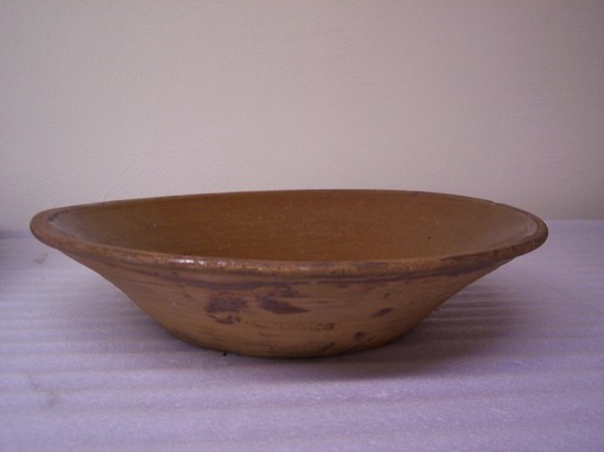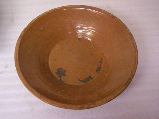 CLEAR GLAZED INTERIOR, UNGLAZED EXTERIOR. LARGE WIDE PAN WITH SLOPING SIDES. ROLLED RIM, PLAIN BASE.