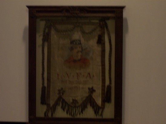 The small silk banner suspends from a gilt dowel. A bust of a male figure is featured in the top two-thirds of the banner. He is hand painted with watercolor, and the colors are still vibrant. His clothing is painted in reds and yellows. The figure wears a white beaver-style hat with a black band. The hat has "Hose 3" written on it. He has a mustache and a cigar in his mouth. Painted below him on the silk are the words "LVFA/Field Day/Sep 23rd 1891." The silk is edged and embellished with brass cord that is draped in two swags across the top of the banner, centered with an embroidered star. The ends of the cord hang on either side freely and end in tassels. The bottom of the banner is cut to hang in three points and edged with brass fringe. The peaks of the points are centered with two embroidered stars made of thin brass cord and brass sequins. The frame is contemporary to the banner, and echos the overall shape of the banner.