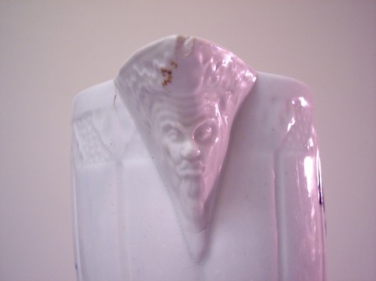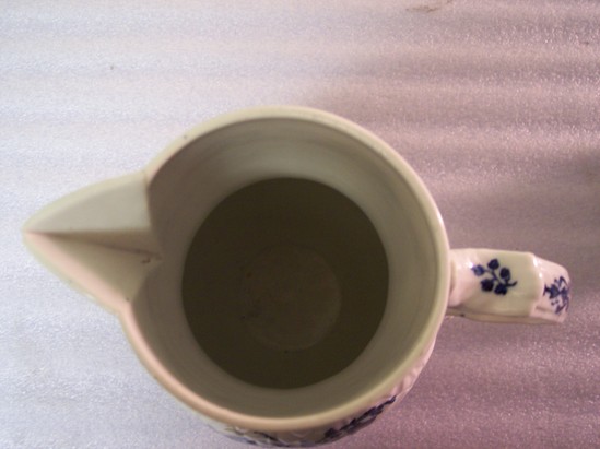 Large, white porcelain pitcher with underglaze blue floral decorations on the body. Leaf molded body, paneled collar with arabesque horizontal panel with dots. Mask-face spout. Round handle with c-scroll above and below -- floral decoration. Slight running of cobalt blue underglaze in floral bouquets. Fairly heavily potted.