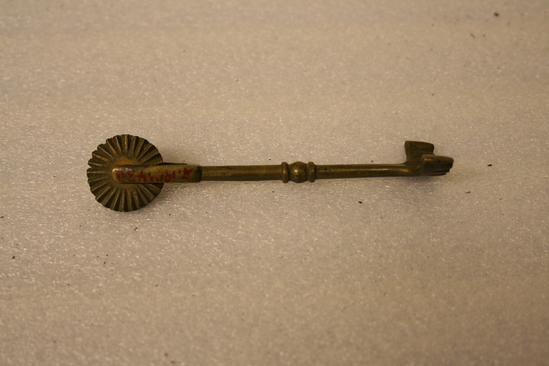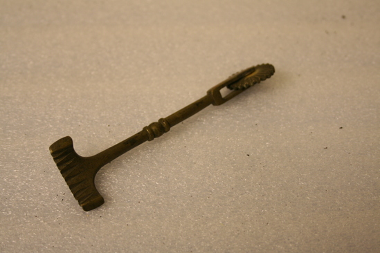 The brass shaft has a wheel at one end to trim pastry off pie edge and the other end has a crimping device