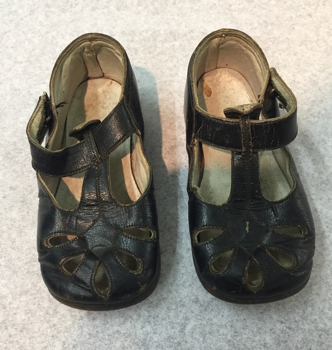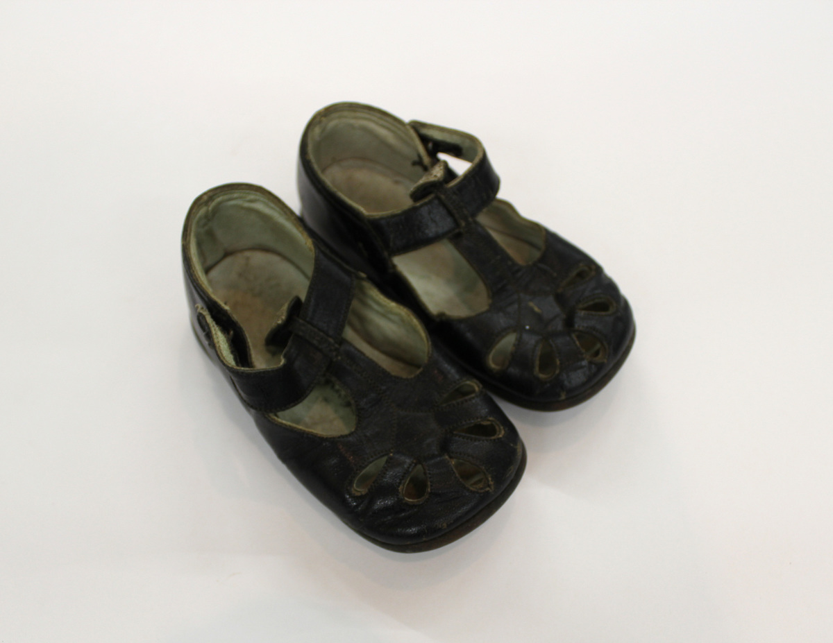 Pair of black leather child's shoes. T-strap style with gray pearl button closure. Five teardrop shapes at top front. Leather soles with metal nails. Printed inside right shoe bottom: "Lord & Taylor / NEW YORK".