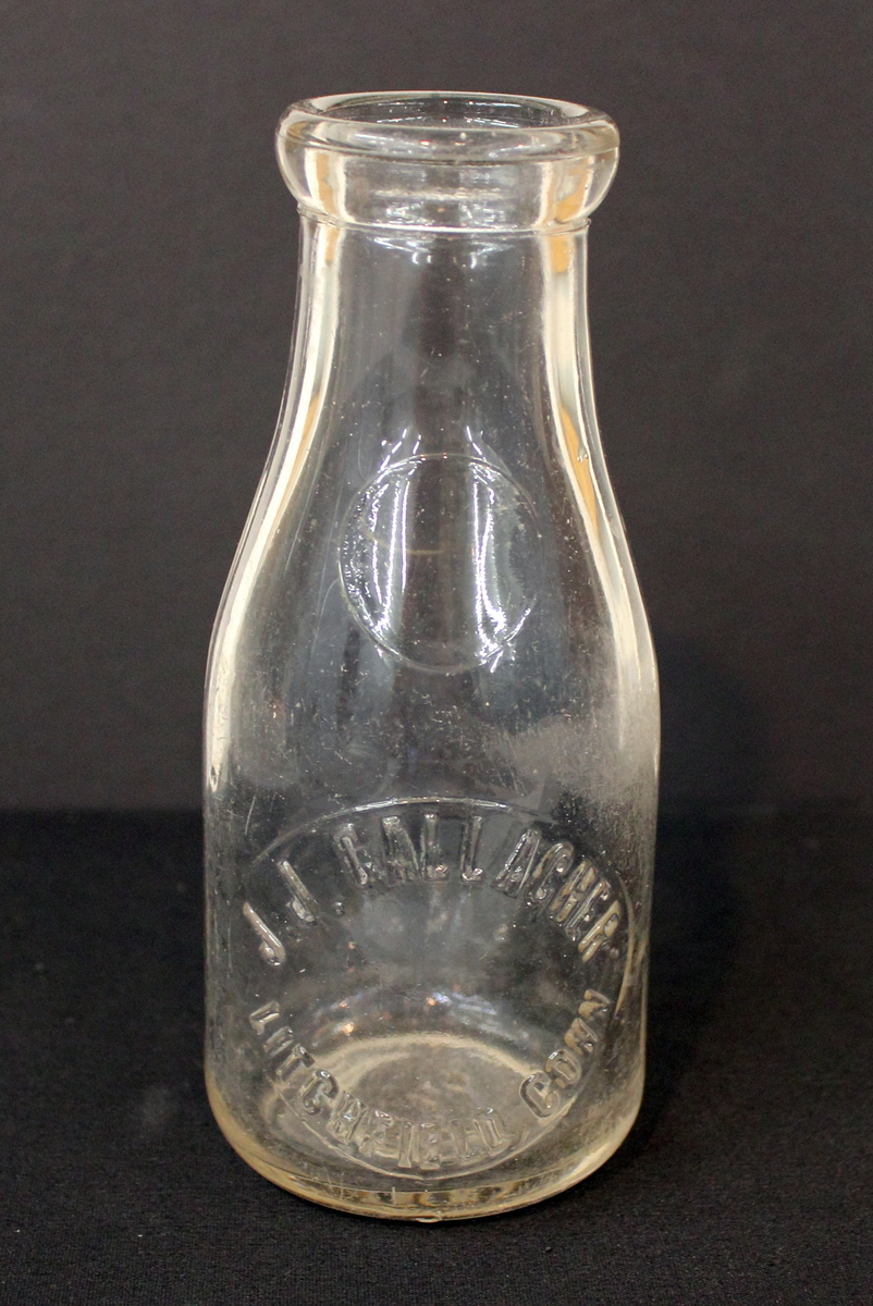 Glass milk bottle with round lip top, circular bottom, and tapered sides. One pint. Embossed lettering on front, "J.J. GALLAGHER/LITCHFIELD CONN." set in circular shape. Impressed circle below neck on front and back. Embossed lettering in bottom, "TMFG CO/17."