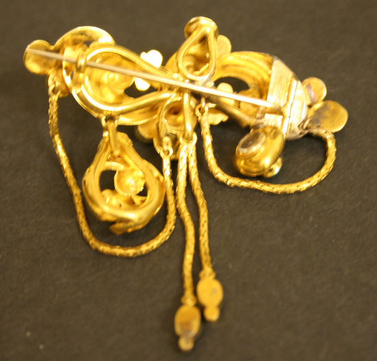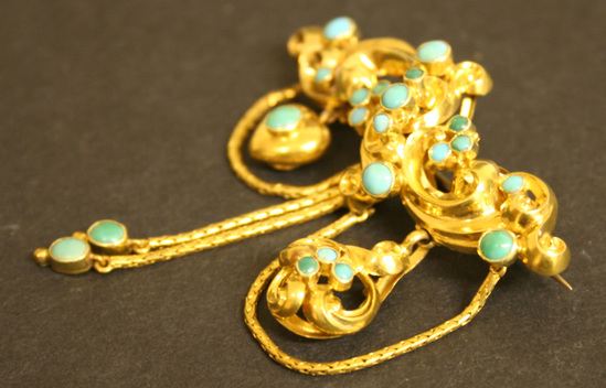 Elaborate brooch - body made of larger twist of gold inset with turquoise. Hanging straight down from center of brooch are two chains of gold with small turquoise stone at the end. A gold heart with turquoise in the center is hanging from the left side and through the back can be seen strands of hair. There is another twist of gold with small turquoise stones hanging from the right side. Two gold chains hang from the center and connect to the outer ends of the brooch creating a loop. Pin on back