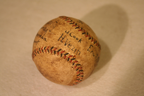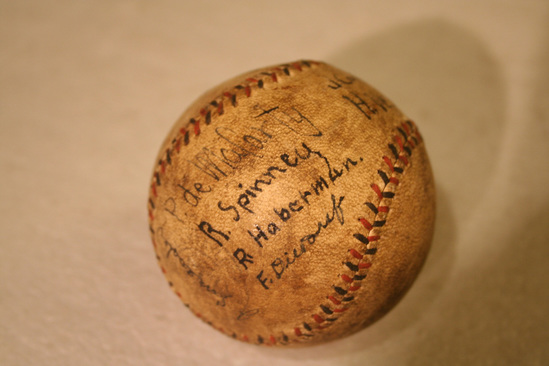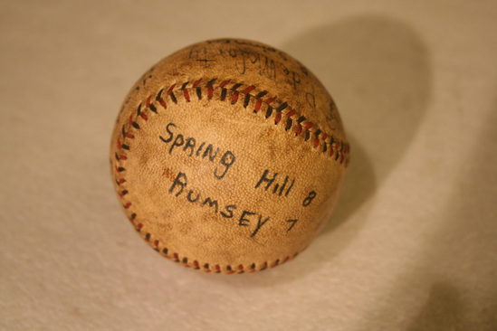Baseball - white leather with blue and red linen stitching. Written in ink on one side "Spring Hill 8/Rumsey 7" Ball is then signed by several players P. deMaCarty R. Spinney R. Haberman F. Dieroref J. Cook H. Vezin Ernest Beatty "Cruik" J. Saneaster