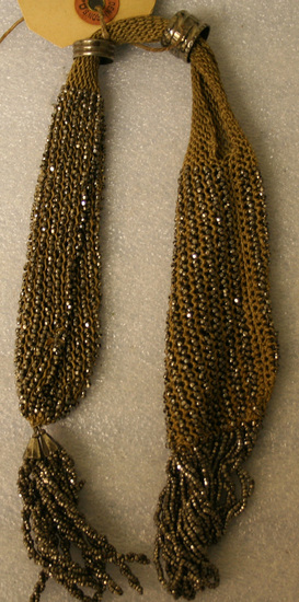 Tan silk knit body. One end has rounded shape and other end has squared off corners. Center has opening and is plain. Each end has silver metal beading strung on knit body. Design of vertical lines. Looped fringe on one end and two clusters of twisted fringe on other end. Two silver metal rings around body - not of the same design. No lining.