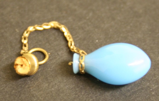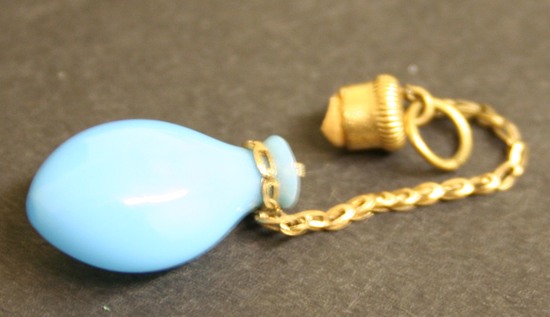 Blue glass flask with gold chain around neck. Gold stopper over cork at end of chain. Large gold ring at top of stopper to attach to chain.