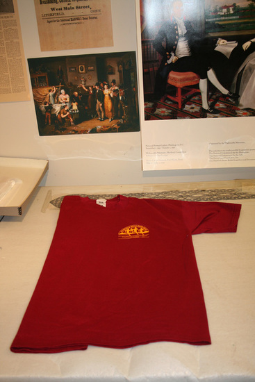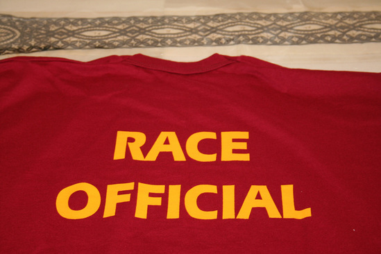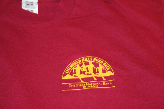 Maroon (or burgandy) short sleeved T-shirt. Logo on front, upper left hand side of shirt, printed in yellow. Arch with "Litchfield Hills Road Race" printed inside of arch. 3 runners and a steeple or tower underneath arch. "The First National Bank of Litchfield" printed underneath logo. "Race Official" printed in large block letters across back of shirt.