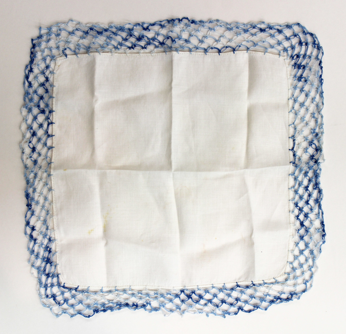 White linen square handkerchief. Blue, variegated thread crochet trim on all sides.