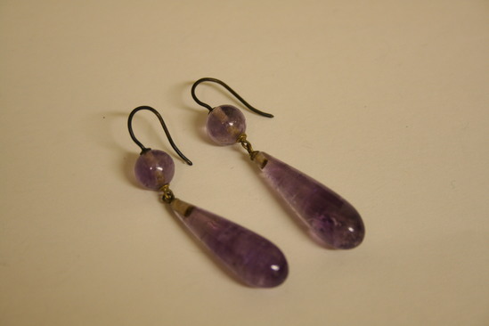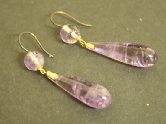 Pair of earrings for pierced ears. Simple pierced ear loop with ball and tear drop pendant of fractured light purple amethyst.