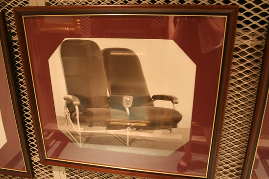 Horizontal black and white photograph of double airplane seat. One seat is upright and the other is tilted back. Framed under glass with a maroon mat board and wooden frame with a gold line on interior edge.