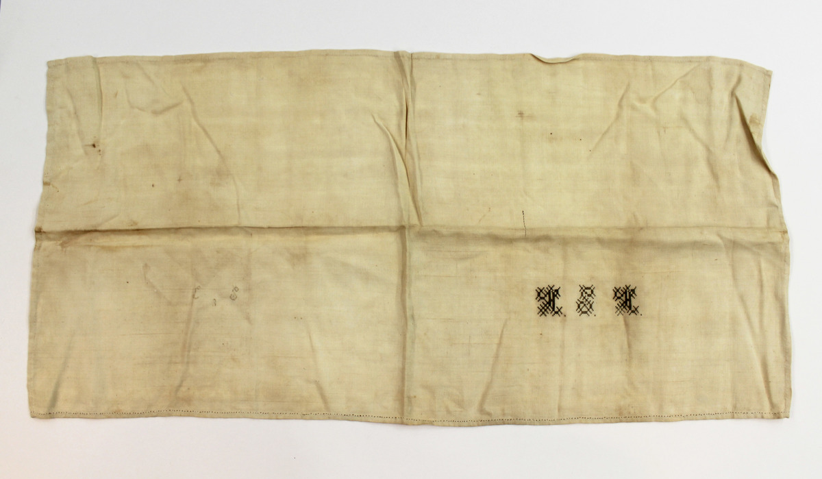 Rectangular linen napkin; cross-stitched in silk in bottom quarter on one side, "HSH."